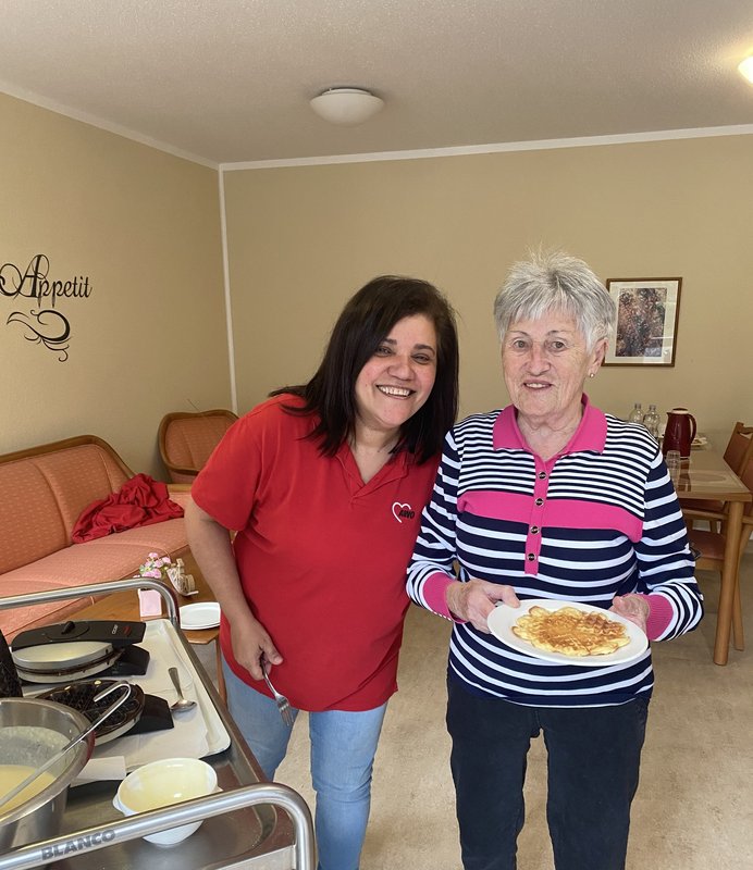 Die Hauswirtschaft sorgt bei dieser Aktion nicht nur für den Waffelteig, sondern trägt auch entscheidend dazu bei, den Alltag der Bewohner zu verschönern. Oft im Hintergrund tätig, sorgt sie mit viel Hingabe dafür, dass solche kleinen, aber besonderen Momente im Alltag möglich sind, Momente, die für Wärme, Wohlbefinden und Gemeinschaft sorgen.