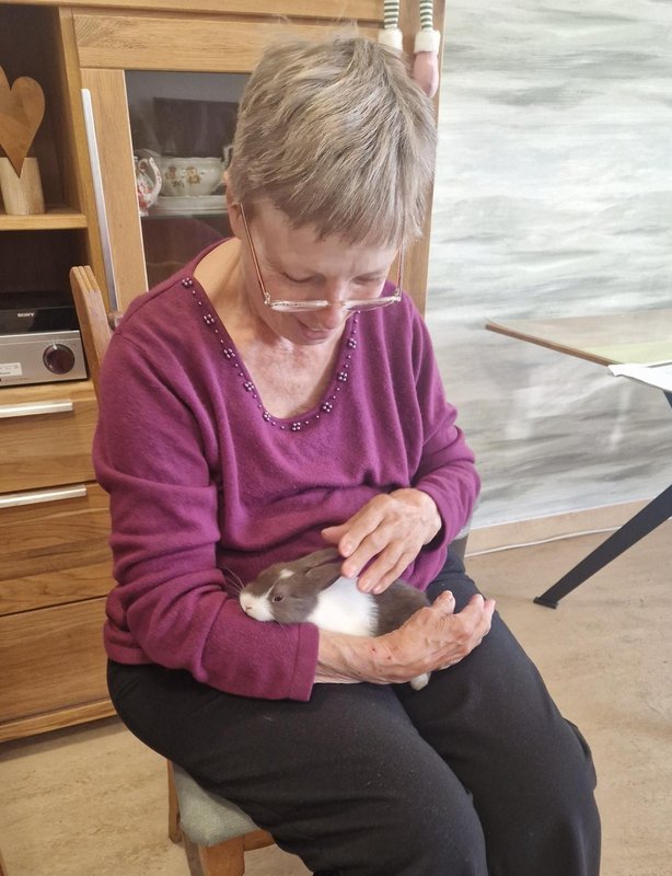 Ein ganz besonderes Highlight des Tages war der Besuch der Tiertherapeutin, die zu den Ostertagen ihre Kaninchen mitgebracht hatte. Die flauschigen Tiere sorgten für viele glückliche Gesichter und brachten eine extra Portion Freude und Lebendigkeit in den Raum.
