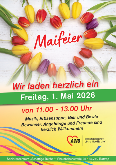 Am 01. Mai 2026 von 11:00 bis 13:00 Uhr lädt das AWO Seniorenzentrum Schattige Buche herzlich zur traditionellen Maifeier ein. Die Feier findet im Café und bei schönem Wetter, auch auf der Terrasse statt. Freuen Sie sich auf eine fröhliche Atmosphäre mit musikalischer Unterhaltung, einer herzhaften Erbsensuppe, Bier und einer gemütlichen Feier, bei der der Frühling begrüßt und der Tag der Arbeit gemeinsam gefeiert wird. Alle Bewohner, Angehörigen und Besucher sind herzlich eingeladen, diesen besonderen Tag mit uns zu verbringen!